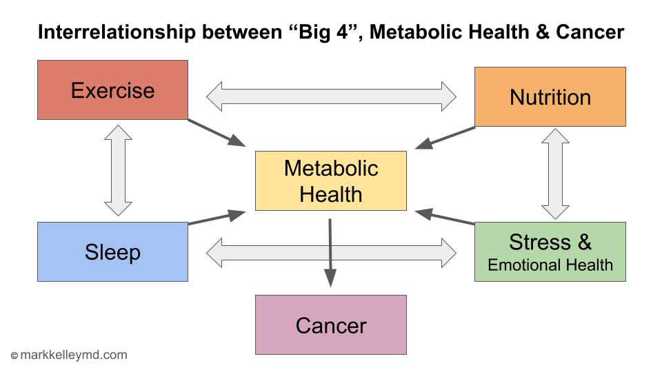 Poor metabolic health, immune dysregulation, chronic inflammation and oxidative stress are all strongly linked to the risk of developing cancer. They are also associated with the response to treatment, risk of recurrence and survival. There is a strong link between markers of poor metabolic health including obesity, diabetes mellitus, insulin resistance and cancer. Impaired immune function and chronic inflammatory disorders are associated with cancer along with many toxins and chemicals that produce oxidative stress. These factors interact with one another to amplify cancer risk. For example, poor metabolic health impairs the immune system and increases inflammation. Immune dysfunction alters glucose metabolism and increases inflammation. Chronic inflammation inhibits glucose metabolism and immune function. Oxidative damage impairs metabolism and the immune system and amplifies inflammation. Interventions that improve metabolic health and immune function, reduce inflammation and oxidative stress will have an additive or synergistic effect on cancer outcomes. The great news is that the most effective way to improve metabolic health is through optimizing “lifestyle factors” such as nutrition, exercise, sleep, stress and emotional health. Improvements in these “big 4” factors are additive and work together to improve metabolic health and reduce cancer risk (figure 3). The focus of this site is to help you learn what changes can improve your metabolic health, and how to make them.