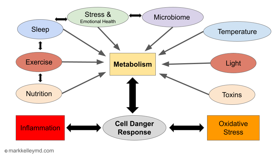 How are these aspects of metabolism all linked together? It turns out that the “power plants” are the key. As we discussed, metabolism describes the processes that the body uses to convert the energy in food into energy that can be used by cells. This energy conversion occurs in mitochondria, which are the “power plant” of the cell. When mitochondria become less effective, the ability of cells to produce energy decreases. “Underpowered” cells cannot perform their function and transmit “danger signals” to other cells. The danger signals increase inflammation and oxidative stress, which causes damage to other normal cells. This is a root cause for many chronic diseases, including cancer.